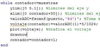 Lo siguiente es crear un ciclo con el cual se van a ir tomando una a una las muestras enviadas por el arduino, además de eso se hace la conversión del valor entregado por el ADC de arduino a un valor de voltaje y por último se realiza la grafica del voltaje.