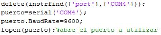 En las siguientes líneas lo que se hace es borrar cualquier rastro anterior que quede en el puerto COM que se vaya a utilizar, esto se hace borrando por completo el puerto, luego se vuelve a crear un nuevo puerto COM, se declara la velocidad en baudios a la que se va a realizar la comunicación y por último se abre ese puerto que se acaba de crear.