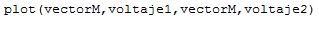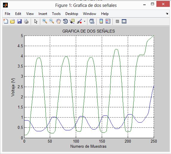 Donde vectorM es una variable que contiene los números desde el 1 hasta el números de muestras que se van a mostrar en el eje X, voltaje1 y voltaje2 son las dos señales que se quieren graficar.
